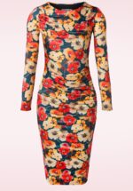 ”Bloom baby, bloom!” Deze curve hugging beauty is uitgevoerd in een stretchy en slinky, glanzend tealblauw stofje met een prachtige, kleurrijke bloemenprint die ook nog eens heerlijk draagt. * Pencil * Hoge halslijn * Flatterende plooitjes * Lange mouwen * Geheel gevoerd * Geen rits of knopen; aantrekken en ready to go! * Valt bij een lengte van 1,70 m over de knie * Exclusief bij Topvintage verkrijgbaar