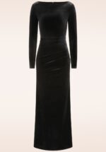 “She was mystery wrapped in black velvet.” Deze beauty heeft een elegante boothals, lange mouwen, plooien in de taille die super flatterend werken en een prachtige uitlopende maxi rok. Uitgevoerd in een soepele en stretchy, zwarte stof met de look and feel van luxe fluweel. * Maxi jurk * Boothals * Gevoerde top * Lange mouwen * Flatterende plooien in de taille * Blinde rits achterzijde * Uitlopende maxi rok * Exclusief bij Topvintage verkrijgbaar * Reikt bij een lengte van 1,70 m tot aan de enkel