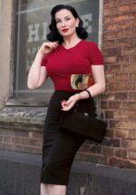 “This skirt doesn’t follow trends… it sets the agenda.” Dit seizoen hebben onze getalenteerde in-house designers zich laten inspireren door draagbare en klassieke silhouetten met een White Collar Edge; items voor de power vrouw die de zakenwereld omver blaast met haar hyper vrouwelijke silhouet. Starlet is uitgevoerd in een stevige, maar soepele zwarte high quality travel stof, die niet kreukt en voorzien is van een fijne stretch, waardoor ze ongelofelijk comfortabel draagt! “Tailored to turn heads and close deals.” * Pencil * Hoog taille model * Uitlopend ‘fishtail’ detail * Blinde rits aan de zijkant * Lira Karina is 1,56 m: haar pumps en accessoires zijn haar eigen treasures * De matching blazer top is apart verkrijgbaar in onze shop!