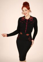”Roses are red, violets are blue, you are nice and this skirt is too!” Dit aansluitende prachtexemplaar met fantastische geborduurde rozen en zijwaartse steekzakjes met rode details mag niet ontbreken in jouw collectie. Uitgevoerd in een stevige maar soepele bengaline zwarte stof, voor een perfecte aansluitende maar toch comfy fit. * Aansluitend model * Zijwaartse steekzakjes * Blinde rits achterzijde * Splitje aan de achterzijde * Valt bij een lengte van 1,70 m net over de knie * Maak je look compleet en combineer haar met de bijpassende Rose embroidery collar cardigan in zwart