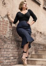 “Denim with a fishtail, sass with a wink… Rizzo would approve!” Deze curve-hugging beauty wordt hoog in de taille gedragen, heeft een sassy fishtail detail en is uitgevoerd in een stevige maar soepel vallende, donker denimblauwe katoenmix met authentieke gele stiksels en een fijne stretch waardoor ze heerlijk draagt. * Pencil stijl * Fishtail detail * ‘Faux’ steekzakje * Authentiek geel stikwerk * Blinde rits in de zijnaad * Valt bij een lengte van 1.70 m over de knie * Gorgeous Sam is 1,70 m * Exclusief bij Topvintage verkrijgbaar