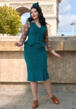 “A tribute to timeless femininity; where soft tailoring meets the romance of Parisian winters.” Deze pencil rok uit de nieuwe collectie is geïnspireerd op de extraordinaire Marie-Louise Carven; Een baanbrekende Franse couturière uit de jaren 40 en 50! Deze hoog getailleerde rok in petrol sluit mooi aan op je silhouet en loopt iets uit dankzij de ‘kickpleat’ details aan de voor- en achterzijde voor extra beweging. Uitgevoerd in een stevige maar zachte ribfluwelen katoenmix met een lichte stretch die heerlijk draagt. * Pencil rok * Hoge taille * Ritssluiting achterzijde * Kickpleats * Valt bij een lengte van 1,70 m net over de knie * Maak je look compleet en combineer haar met het bijpassende gilet
