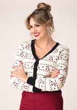 ”Sour moods? Not in my cherry cardi!” Dit retro vestje is door onze eigen in-house designers ontworpen en exclusief bij Topvintage verkrijgbaar! Afgewerkt met een V-hals, een knopenreeks en uitgevoerd in een fijngebreide, stretchy katoenmix in gebroken wit en navy met een opengewerkt ajourpatroon en een patroon van kersjes. * V-halslijn * Lange mouwen * Knopenreeks * Stretchy ribboorden * Lang genoeg om op een normale heupbroek te dragen * Exclusief bij Topvintage verkrijgbaar * Let op; de kleur van het product op de video kan afwijken van de daadwerkelijke kleur van het product