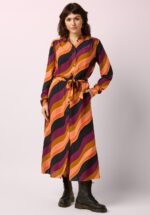 “Stripes that speak louder than words!” Olivia Razzle heeft een lossere pasvorm, is voorzien van handige steekzakken en heeft een prachtige print van kleurrijke strepen . Ze draagt heerlijk luchtig en is een genot om te dragen dankzij de soepele EcoVero viscose, welke een milieuvriendelijk alternatief voor regulier viscose is. * Midi jurk * Lossere pasvorm * Puntig kraagje * Knopenreeks * Lange mouwen * Afneembaar striklint voor een extra ‘snatched’ taille * Voorzien van zakken! * Reikt bij een lengte van 1,70 m tot op de kuit