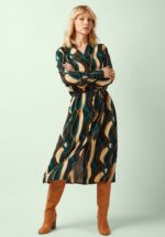 “A graphic vision, wrapped in eco-conscious style.” Deze midi doorknoopjurk is speels maar toch heel vrouwelijk door haar top met puntig kraagje, lange mouwen met manchet en het afneembare striklint in de taille. Uitgevoerd in een heerlijk soepele, zwarte EcoVero viscosemix (stretcht niet) met een grafische print. * Midi model * Doorknoopjurk * Puntig kraagje * Lange mouwen met manchet * Afneembare strikband voor een extra ‘snatched’ taille * It has pockets! * Geen rits * Reikt bij een lengte van 1,70 m tot over de kuit