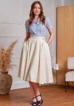 “Swing your way into summer!” Met deze Didi swing rok steel je moeiteloos de show. Dit fifties pareltje wordt hoog in de taille gedragen en loopt vanaf daar uit in een klassieke, elegante swing. De faux knoopdetails aan de zijkant vormen niet alleen een speels accent, maar benadrukken je taille ook extra mooi. Ze is uitgevoerd in een stevige maar soepelvallende, crèmekleurige structuurstof (stretcht amper) die prachtig met je meebeweegt. * Full swing rok * Gevoerd * ‘Faux’ knoopdetails * Zijwaartse steekzakken * Rits- en haaksluiting achterzijde * Combineer met een van onze petticoats voor een extra feestelijk effect * Valt bij een lengte van 1,70 m over de knie