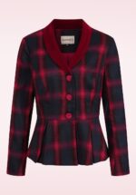 “Tradition in tartan, tailored with a feminine flourish.” Dit blazer jasje kan ook als blouse of top gedragen worden en heeft een speelse afgeronde kraag van fluweel, lange mouwen, een knopenrij aan de voorzijde en een subtiel peplum detail met platte plooitjes. Uitgevoerd in een stevige, maar zachte stof (stretcht nauwelijks), die supercomfortabel draagt. * Afgeronde kraag * Knoopsluiting * Lange mouwen * Peplum detail * Lang genoeg om op een normale heupbroek te dragen