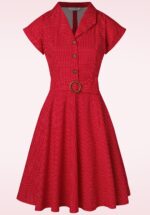 Dat een rode jurk alles behalve saai is, bewijst deze klassieke Polka Dot Dance jurk in rood! Van haar subtiele V-hals met kraagje, de korte mouwen met omslagjes, de reeks knopen op het lijfje tot de vaste tailleriem… deze jurk ademt vrouwelijkheid! Vanaf de taille loopt ze over in een flowy semi-swing rok MET handige steekzakjes die zwierig met je meebeweegt. Uitgevoerd in een stevige maar luchtige, lipstickrode katoenmix met een lichte stretch en witte pin dots, die heerlijk draagt. “Life is too short for boring clothes!” * Semi-swing stijl * V-hals * Knopenrij * Korte mouwen met vaste omslagjes * Vaste tailleriem * Zijwaartse steekzakken * Ritssluiting achterzijde * Valt net over de knie bij een lengte van 1,70 m