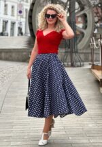 Wat een dotje, deze swing rok! Ze is uitgevoerd in een stevige maar luchtige, navyblauwe katoenmix met een witte polkadot print. Dot days are never over! 😉 * Full swing model: kan gecombineerd worden met een petticoat * It has pockets! * Rits met haaksluiting achterzijde * Valt bij een lengte van 1,70 m over de knie