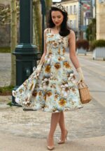 ”Ready to blossom and bloom?!” Mavis heeft een classy sweetheart halslijn, een zwierige swing rok en handige zijwaartse steekzakken. Uitgevoerd in een stevige maar luchtige, grijsblauwe katoenmix met een lichte stretch die heerlijk draagt en bezaaid is met een print van goudbruine bloemen in 3D effect. “Perfect for dancing and romancing!” * Full swing model * Sweetheart halslijn * Steekzakjes * Blinde rits achterzijde * Combineer met een van onze petticoats voor een extra feestelijk effect * Valt over de knie bij een lengte van 1,70 m