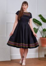“Twirl like Carmen, own the night… Viva la swing!” Deze swing jurk heeft een subtiele boothals, korte kapmouwtjes en loopt uit in een prachtige swing rok voor een super vrouwelijk silhouet. Uitgevoerd in een luchtige en soepele zwarte katoenmix met een hele lichte stretch en ric-rac biesjes in vrolijke kleurtjes. * Swing model * Subtiele boothals * Subtiele v-rug * Korte kapmouwtjes * Blinde rits- en haaksluiting achterzijde * Valt bij een lengte van 1,70 m tot over de knie