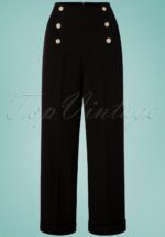 Paradeer over de promenade in stijl met deze 40s Adventures Ahead Button Trousers in Black! Ze maakt met haar vrouwelijke hoge taille, luchtige wijdere pijp en chique omslagjes een dikke knipoog naar de jaren 40 😉 Uitgevoerd in een soepel vallende, zwarte stof met een hele lichte stretch en afgewerkt met klassieke sierknopen aan de taille. Jij en deze stijlvolle broek gaan samen heel wat avonturen beleven!  * Hoge taille * Sierknopen * Wijde pijpen met omslag * Steekzakjes * ‘Faux’ paspelzakjes aan de achterzijde * Blinde rits aan de achterzijde