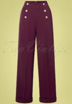 Creëer eindeloos veel looks met deze 40s Day To Night Button Trousers in Burgundy! Ze maakt met haar vrouwelijke hoge taille, luchtige wijdere pijp en chique omslagjes een dikke knipoog naar de jaren 40. Uitgevoerd in een soepel vallende, bordeauxrode stof (stretcht amper) en is afgewerkt met klassieke sierknopen aan de taille. Klaar met je werkdag? Mooi! Gooi er wat bling bij en deze beauty is klaar voor een avondje uit! 😉  * Hoge taille * Sierknopen * Wijde pijpen met omslag * Zijwaartse steekzakken * ‘Faux’ paspelzakjes aan de achterzijde * Blinde rits en haaksluiting achterzijde