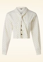 ”Life needs a few more polka dots!” Deze cutie heeft een omslagkraagje met vaste strikbanden, lange mouwen en prachtige goudkleurige knoopjes met een zwart fluwelen afwerking. Ze is uitgevoerd in een stevige, maar soepele en stretchy creme kleurige stof, voorzien van zwarte polka dots. * Korter model * Omslagkraagje met vaste strikbanden * Lange mouwen * Gouden knopenreeks met fluwelen afwerking