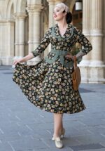 ”Look your best in Ashira Lou!” Een pracht exemplaar dat geïnspireerd is op een tweedelig mantelpakje uit de nieuwe collectie van Miss Candyfloss: ”Vintage Glam Icons”. De collectie is geïnspireerd op de glamoureuze eerste super modellen! Ze is uitgevoerd in een soepele en stretchy, zwarte viscosemix, voorzien van een prachtige bloemen print. * Swing jurk * Dubbele kraag * 3/4 mouwen met vaste omslagjes * Rits en knopenreeks voorzijde * Peplum detail * Afneembare riem, voor een extra ‘snatched’ taille * Voorzien van zakken * Valt bij een lengte van 1,70 m over de knie