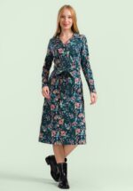Helena Autumn Bouquet maxi jurk in petrol en multi”Falling for fall… and for Helena!” Op deze prachtige maxi jurk raak je nooit uitgekeken. Want wow… wat een geweldige bloemenprint in warme, herfstachtige kleuren! Helena is uitgevoerd in een superzachte, soepele en stretchy EcoVero viscosemix die heerlijk draagt en bij elke stap sierlijk met je meebeweegt. * Maxi jurk * Revers kraag * Lange mouwen * Knopenreeks * Afneembare striklint, voor een extra ‘snatched’ taille * Reikt bij een lengte van 1,70 m tot boven de enkel * EcoVero viscose