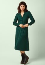 Lola Piper jurk in botanisch groen“Dotting my way through the day!” Lola is prachtig om te zien en heerlijk om te dragen dankzij de soepele en luchtige EcoVero viscose, welke een milieuvriendelijk alternatief voor regulier viscose is. * Midi jurk * Knopenrij * Lange mouwen * Afneembare strikband voor een extra ‘snatched’ taille * It has pockets! * Reikt bij een lengte van 1,70 m tot op de kuit
