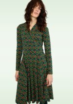 ”Made for cozy days and endless compliments.” Deze beauty heeft lange mouwen, een elegante V-halslijn met vaste overslag en flatterende plooitjes. De subtiele tailleband accentueert je figuur op een natuurlijke manier, terwijl de knielange, zwierige rok prachtig met je meebeweegt. Ze is uitgevoerd in een supercomfortabele, stretchy donkergroene bio-katoenmix met een grafisch printje van bloemen en hartjes. * Swing model * Lange mouwen * Vaste geplooide overslag * Geen rits of knopen; aantrekken en ready to go! * Valt net over de knie bij een lengte van 1,70 m