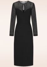 “Spin your web of enchantment.” Deze LBD heeft een aansluitende fit, een sweetheart halslijn met lange mesh mouwen voorzien van een spinnenweb patroon. Uitgevoerd in een stevige, stretchy bengaline- achtige, flatterende stof die heerlijk draagt. * Pencil model * Sweetheart halslijn met keyhole-detail * Lange mouwen van mesh * Blinde rits met haaksluiting achterzijde * Split achterzijde * Valt bij een lengte van 1,70 m net over de knie