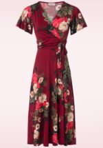 ”Ze is een echt vintage pareltje!” Ze heeft een prachtige aansluitende overslag top met een sexy V-halslijn, speelse strikbandjes en een flatterende geplooide tailleband. De zwierige vlindermouwtjes geven haar een flirty touch terwijl de flatterende semi-swing rok zorgt voor een flinke portie elegantie. Ze is uitgevoerd in een glad en soepel, licht glanzend, stretchy wijnrood stofje bezaaid met een kleurrijke bloemenprint in roze, dat garant staat voor veel kreukvrij draagplezier. Irene is liefde, pure jurken-liefde! * Semi-swing model * V-halslijn * Vaste gevoerde overslag top * Korte vlindermouwen * Vaste strikbandjes * Geen rits of knopen; aantrekken en ready to go! * Valt over de knie bij een lengte van 1,70 m