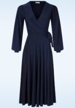 “Navy nights, effortless elegance!” Voel je vrouwelijk en zelfverzekerd in Athena! Ze heeft een flatterende taille, lange pofmouwen voor extra drama en elegantie, en loopt vanaf de taille subtiel uit in een zwierige semi-swing rok. Uitgevoerd in een soepel, licht glanzend slinky stofje dat heerlijk meebeweegt bij elke stap. Perfect voor een chique avondje uit of een stijlvolle daglook met een retro touch. * Semi-swing stijl * V-hals met overslag * Gevoerde top (m.u.v. de mouwen) * Lange pofmouwen met manchetten * Vast strikdetail in de taille * Geen rits of knopen; aantrekken en ready to go! * Exclusief bij Topvintage verkrijgbaar * Valt bij een lengte van 1,70 m ruim over de knie