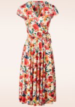 Deze Layla Watercolour Floral Cross Over jurk is een echte vintage beauty die geschikt is voor iedere gelegenheid! De aansluitende top heeft een prachtige V-halslijn, mooie overslag, speelse strikbandjes die je zowel los als gestrikt kunt dragen en flatterende plooitjes in de zij. Vanaf de taille waaiert ze uit in een zwierige semi-swing rok. Ze is uitgevoerd in een glad en soepel, licht glanzend, stretchy crème gekleurd stofje voorzien van een kleurrijk waterverf bloemenprintje. “Layla we’re in love!” * Semi-swing stijl * Vaste gevoerde overslag * Korte mouwtjes * Vaste strikbandjes * Geen rits of knopen; aantrekken en ready to go * Valt over de knie bij een lengte van 1,70 m