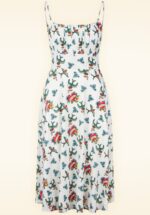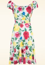 ”Vintage charm in full bloom!” De wonderschone Scarlet mag niet ontbreken in de garderobe van een vintage loving lady! Ze heeft een top met een geplooide buste, korte mouwtjes met elastiek die off shoulder gedragen kunnen worden en vanaf de taille loopt ze uit in een flowy swing rok, die je een prachtig silhouet geeft. Ze is uitgevoerd in een glad en soepel, licht glanzend en stretchy wit stofje met een kleurrijke rozenprint, dat garant staat voor veel kreukvrij draagplezier. Dus ook ideaal voor mee op reis! 😉 * Swing model * Geheel gevoerd * Mouwtjes die off shoulder gedragen kunnen worden * Geen rits of knopen; aantrekken en ready to go! * Valt bij een lengte van 1.70 m net over de knie