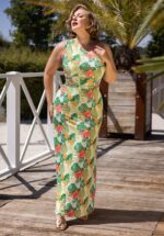 Olga Tropical Leaves One Shoulder maxi jurk in groen