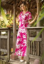 Wanneer je Malia aantrekt weet je het meteen; ze is perfect voor de zomer! Uitgevoerd in een glad en soepel, licht glanzend, stretchy, slinky stofje met een print van tropische bloemen in wit en fuchsia, dat garant staat voor veel kreukvrij draagplezier. * Maxi jurk * Gevoerde top voor extra comfort * Vaste strikbandjes * Vlindermouwtjes * Geplooide tailleband * Volledig gevoerd * Geen rits of knopen; aantrekken en ready to go! * Reikt bij een lengte van 1,70 m tot aan de grond