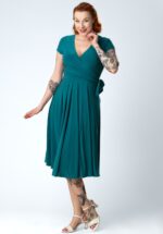Deze Layla overslag jurk in teal is een echte vintage beauty die geschikt is voor iedere gelegenheid! De aansluitende top heeft een prachtige V-halslijn, mooie overslag, speelse strikbandjes die je zowel los als gestrikt kunt dragen en flatterende plooitjes in de zij. Vanaf de taille waaiert ze uit in een zwierige semi-swing rok. Ze is uitgevoerd in een glad en soepel, licht glanzend, stretchy teal gekleurd stofje. “Layla we’re in love!” * Semi-swing stijl * Vaste gevoerde overslag * Korte kapmouwtjes * Vaste strikbandjes * Geen rits of knopen; aantrekken en ready to go * Valt over de knie bij een lengte van 1,70 m