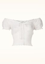 “Wildflower spirit.” Deze top in Carmen stijl heeft korte pofmouwtjes die ook off-shoulder gedragen kunnen worden, een geplooid detail met strik bij de buste en is uitgevoerd in een dubbelzijdige, luchtige 100% katoen broderie. * Korte pofmouwtjes die ook off-shoulder gedragen kunnen worden * Elastisch smokwerk vanaf de taille * Gevoerd bij de buste om doorschijnen te voorkomen * Geplooid detail met vaste strik bij de buste * Blinde ritssluiting zijkant * Cropped model