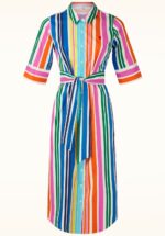 “Maxi style, endless color.” Deze maxi-beauty heeft een elegant puntig kraagje, een stijlvolle knopenrij aan de voorzijde en een strikband in de taille die je silhouet prachtig accentueert. Ze is uitgevoerd in een soepele, luchtige katoenmix met een lichte stretch voor een comfortabele pasvorm en afgewerkt met een kleurrijke gestreepte print. * Maxi jurk * Puntig kraagje * Knopenreeks * Afneembare strikriem * Reikt bij een lengte van 1,70 m tot over de kuit