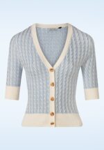 ”Buying this 60s Regatta Race Stripe Knit Cardigan in Blauw will leave you with no regretta!” 😉 Deze cardigan heeft een V-halslijn, 3/4 mouwen en een reeks houten knopen. Uitgevoerd in een zachte, fijngebreide, lichtblauwe viscosemix met een heerlijke stretch en is voorzien van een kabelpatroon met ivoorwitte details. Je sixties outfit afmaken doe je met deze cutie! * V-halslijn * 3/4 mouwen * Reeks knopen * Elastische boordjes