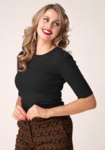 Elegant maar schattig… eenvoudig maar toch speciaal door de lieflijke details. Deze top heeft een mooie slash halslijn en flatterende 3/4 mouwtjes met splitjes die afgezet zijn met kleine vaste strikjes, só cute! Uitgevoerd in een heerlijk soepele, stretchy zwarte viscosemix die zijn perfecte pasvorm zal blijven behouden, zelfs na een aantal wasbeurten. Een veelzijdige classy top die niet mag ontbreken in de kast van iedere vintage lady, de naam zegt al genoeg; wij zijn addicted! * ‘Slash’ hals * 3/4 mouwen met strikjes * Lang genoeg om op een normale heupbroek te dragen