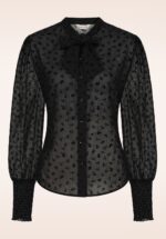 “A little velvet goes a long way!” Deze prachtige blouse ademt romantiek en elegantie. Ze is doorschijnend en versierd met een fluwelen bloemetjesprint, heeft lange pofmouwen met elastisch smock en vaste strikbandjes bij de halslijn die een verfijnde, vrouwelijke touch toevoegen. De lichte, soepel vallende stof voelt heerlijk comfortabel aan en geeft een elegante look die moeiteloos combineert met high waist broeken of rokken. * Klein opstaand kraagje met vaste strikbanden * Lange doorzichtige pofmouwen met elastisch smock * Knopenrij * Lang genoeg om op een normale heupbroek te dragen