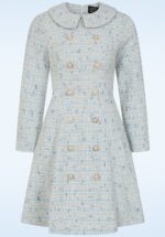 “Luxury you can feel, grace you can wear.” Grace heeft een speels kraagje, lange mouwen, opvallende goudkleurige sierknopen en een speelse a-lijn snit. Uitgevoerd in een iets dikkere, stevige maar soepele bouclé achtige stof (stretcht amper) in wit en blauwtinten die heerlijk draagt. * A-lijn * Kraagje * Lange mouwen * Dubbele ‘faux’ knopenrij * Zijwaartse steekzakken * Blinde rits achterkant * Geheel gevoerd * Valt bij een lengte van 1,70 m op de knie