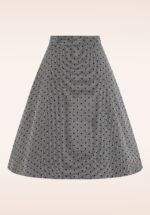 “Monochrome magic, dotted in velvet.” Deze swing beauty is voorzien van zwarte, fluwelen polkadotjes en is uitgevoerd in een stevige maar soepele, geweven structuur stof in zwart. * Swing rok * It has pockets! * Rits met haaksluiting achterzijde * Valt bij een lengte van 1,70 m over de knie