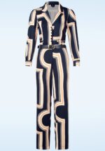 “One-and-done chic… this graphic navy jumpsuit makes bold moves feel effortless.” Deze jumpsuit met wijde pijpen is uitgevoerd in een soepel en stretchy, slinky stofje in navy met een grafische print in crème en bruin, voorzien van een StayFresh coating. * Jumpsuit * Puntig kraagje * Knopenreeks top * Knoop- en ritssluiting voorzijde broek gedeelte * Afneembare riem, voor een extra ‘snatched’ taille * It has pockets! * Decoratieve paspelzakken achterzijde * Lange, wijde pijpen * StayFresh coating!