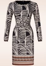 ”She’s a top knot!” Deze Veronique jurk heeft een subtiele A-lijn en is uitgevoerd in een soepele en stretchy, gladde slinky stof met een StayFresh coating en een zwart/witte print met bruine details aan de onderzijde. * Subtiele A-lijn * Lange mouwen * Gevoerd * Geen rits of knopen; aantrekken en ready to go! * Valt bij een lengte van 1,70 m tot net boven de knie