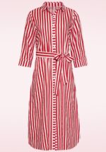 “Stripes made for sunshine days.” Deze midi doorknoopjurk met een rood-wit gestreepte print is uitgevoerd in een soepele en luchtige rayon (zonder stretch), die perfect is voor warme dagen. * Midi jurk * Puntig kraagje * Knoopsluiting * 1/2 wijde mouwen * Afneembaar striklint, voor een extra ‘snatched’ taille * Reikt bij een lengte van 1,70 m tot halverwege de kuit
