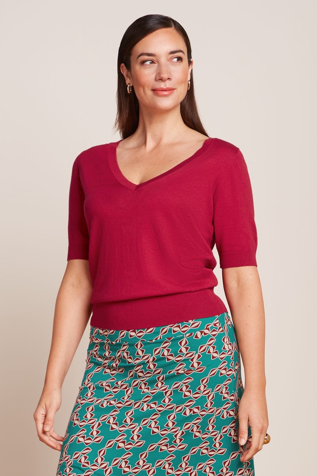 Deze Agnes Cocoon top heeft ons hartje weten te veroveren! Ze heeft een V-halslijn, korte mouwen en is uitgevoerd in een zachte, soepele en fijngebreide rode katoenmix met een vleugje zijde die heerlijk draagt. Klopt jouw hartje al sneller?   * V-halslijn * Korte mouwen * Stretchy ribboorden * Lang genoeg om op een normale heupbroek te dragen