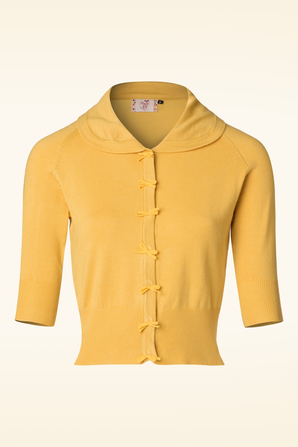 Deze schattige 40s April Bow Cardigan in Mustard Yellow heeft ons weten te strikken! Bows are everything! Classy en schattig met haar elegante halve mouwtjes, speelse Peter Pan kraagje en lieflijke strikjes. Uitgevoerd in een zachte, stretchy, fijngebreide mosterdgele viscosemix waardoor ze heerlijk draagt. De combinatiemogelijkheden zijn eindeloos!   * Korter model * 1/2 mouwen * Rij verborgen drukknoopjes * Vaste strikken * Stretchy ribboord langs de mouwtjes en onderkant