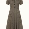 Betty Means zakelijke penciljurk in grijs pied-de-poule-motief