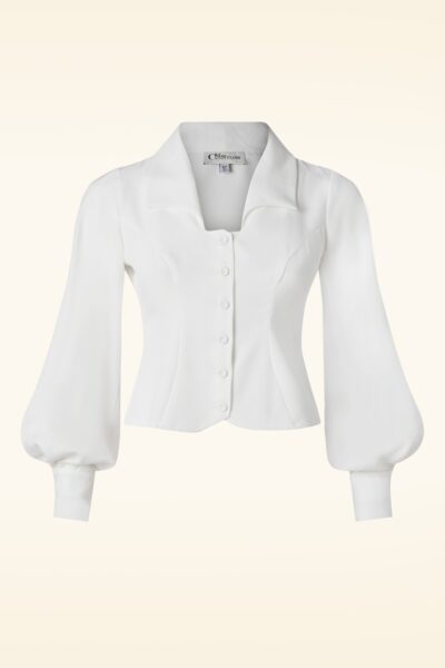 ”Elevate any of your looks with this timeless staple!” De nieuwe collectie ”Vintage Glam Icons” van Miss Candyfloss is geïnspireerd op de glamoureuze eerste super modellen! Arien Gia is uitgevoerd in een lichte en soepele, gebroken witte stof (stretcht niet), die heerlijk draagt.  * Getailleerd model met afgeronde zoomlijn * Vierkante halslijn met puntige kraag  * Lange bischopsmouwen met manchetten * Knopenrij * Lang genoeg om op een normale heupbroek te dragen