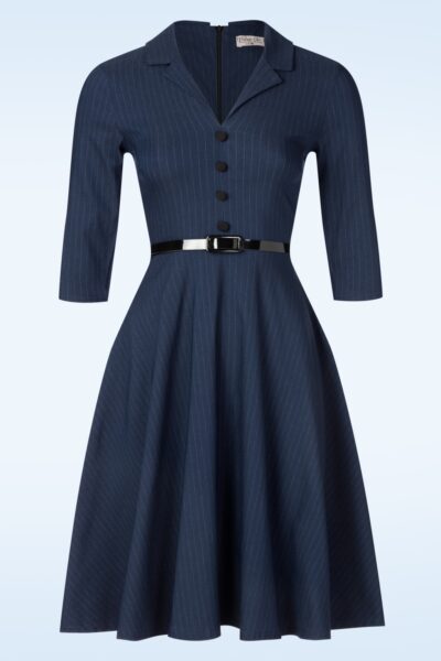 ”Effortlessly chic, effortlessly me!” Deze classy semi swing beauty heeft een elegante v-halslijn met revers kraag, decoratieve knoopjes aan de voorzijde en is voorzien van handige steekzakken. Ze is uitgevoerd in een stevige maar stretchy bengaline achtige marineblauwe stof voorzien van een witte krijtstreep, die heerlijk comfortabel draagt.    * Swing model * V-halslijn met revers kraagje * Sierknopen aan de voorzijde  * 3/4 mouwen * Afneembaar lakriempje, voor een extra ‘snatched’ taille * Voorzien van zakken! * Blinde rits achterzijde * Valt bij een lengte van 1,70 m net over de knie