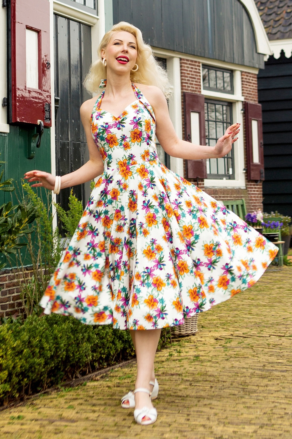 ”Just another day in paradise!” Zeker wanneer je Bettie draagt! 😉 Ze is exclusief verkrijgbaar bij Topvintage en uitgevoerd in een stevige maar soepel vallende, luchtige, witte katoenmix met een lichte stretch. De aansluitende haltertop zorgt voor een mooi decolleté en vanaf de taille loopt ze uit in een zwierige volle swing rok. Bovendien is ze voorzien van een kleurrijke print van tropische bloemen die met liefde door onze eigen in-house designers ontworpen is.   * Vol swing model * Gevoerde halter top * Plooitjes bij de buste * Zijwaartse steekzakken * Blinde rits achterzijde * Kan gecombineerd worden met een van onze petticoats * De print is door onze eigen in-house designers ontworpen * Exclusief bij Topvintage verkrijgbaar * Gorgeous Julia Fiore (Fiorevanil) is 1,70 m; haar accessoires zijn haar eigen vintage treasures