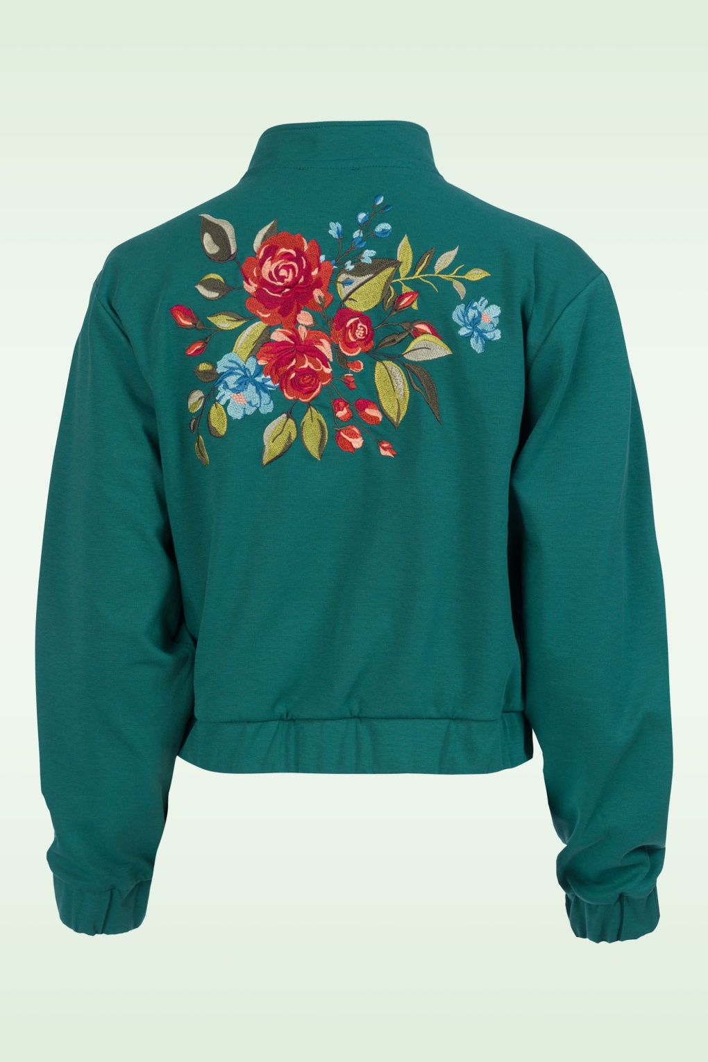 ”Bold blooms, vintage vibes!” Dit petrolblauwe jasje is een echte blikvanger. De voorkant oogt clean en tijdloos met stoere drukknopen, maar de achterkant verrast met een prachtige geborduurde bloemenpatch die een speelse, vrouwelijke touch geeft. Uitgevoerd in een stevige maar soepel vallende, stretchy mix van organisch katoen en gerecyclede materialen – duurzaam, comfortabel én perfect om elke outfit een retro flair te geven.    * Jack * Opstaand kraagje * Lange mouwen * Drukknopen * Voorzien van zakken * Bloemen borduursel achterzijde  * Lang genoeg om op een normale heupbroek te dragen