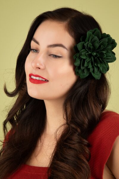 Deze haarbloem geeft je (vintage) outfit een pittig Flamenco tintje! De stoffen, bloem in flessengroen is bevestigd op een zilverkleurige metalen clip en ook voorzien van een speldje.  * Clip- en speld sluiting