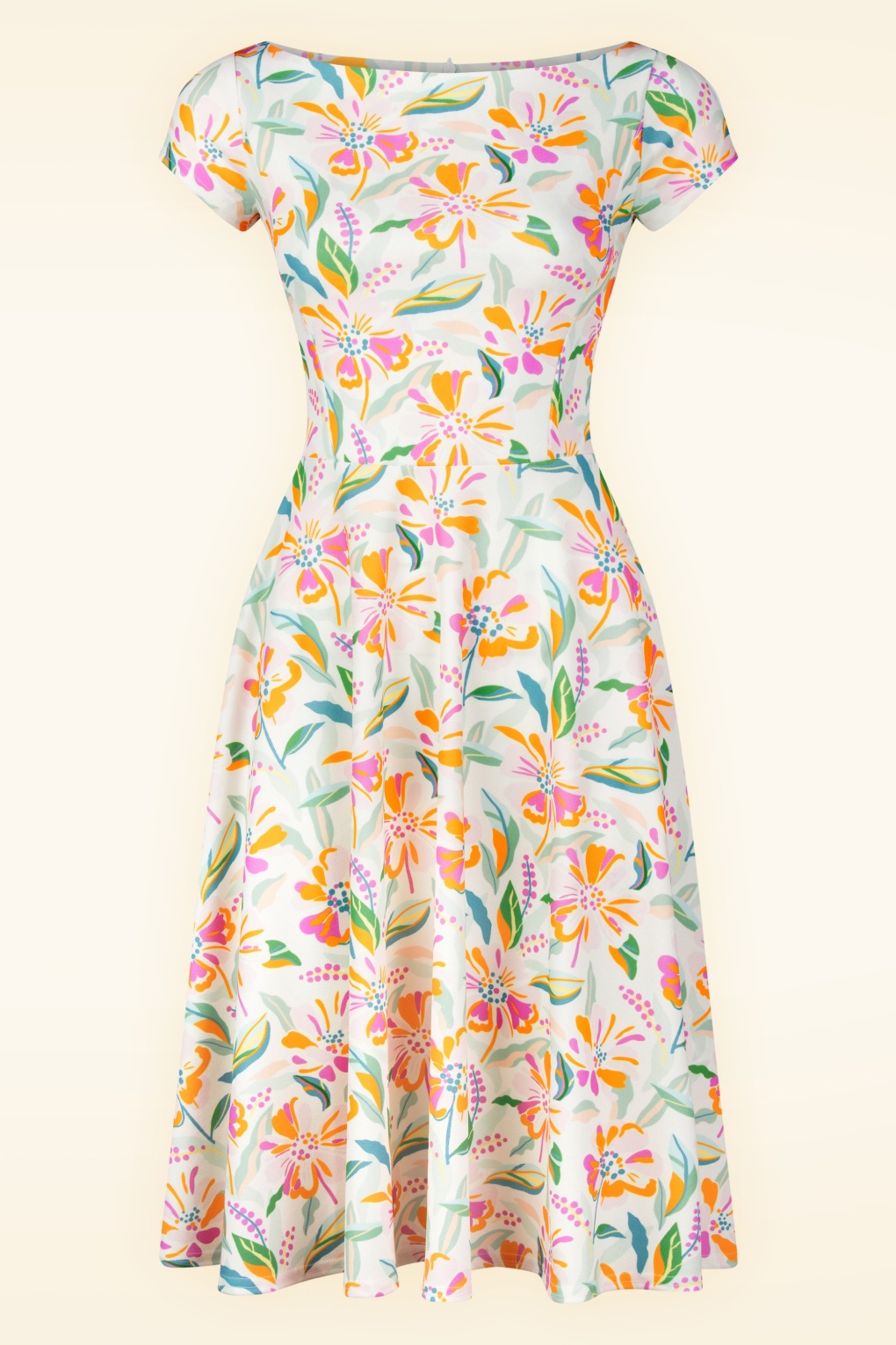 ”Paradise found!” Dat heb je zeker weten met Blythe! Ze heeft een elegante boothals, korte mouwen en loopt vanaf de taille uit in een zwierige swing rok. Uitgevoerd in een soepel en stretchy, gebroken witte crêpe achtige stof dat heerlijk draagt en voorzien is van een kleurrijke bloemenprint.  * Swing model * Gevoerde top * Boothals * Korte mouwen * Blinde rits achterzijde * Valt bij een lengte van 1,70 m over de knie