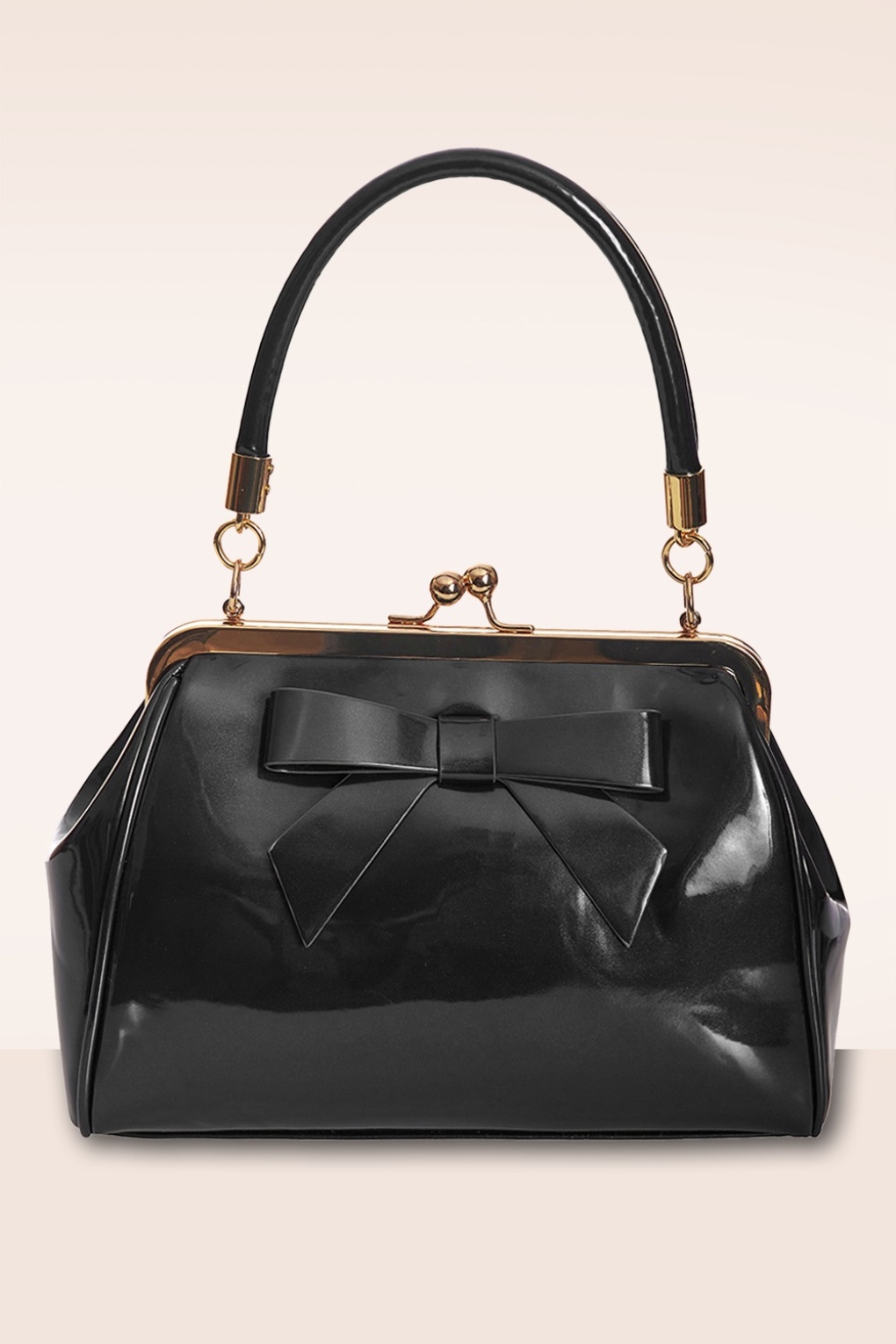 ”California… knows how to party!” Dit kleine zusje van de klassieke American Vintage bag heeft een opvallende goudkleurige metalen klipsluiting voor een echte vintage look en is uitgevoerd in zwart imitatie lakleder afgewerkt met een schattige strik.  * Small sized * Klipsluiting * Binnenvak met 3 extra vakjes, waarvan 1 met rits * Afneembaar hengsel * Kan crossbody gedragen worden * Volledig gevoerd * Groot genoeg voor je telefoon, sleutels, en een kleine portemonnee